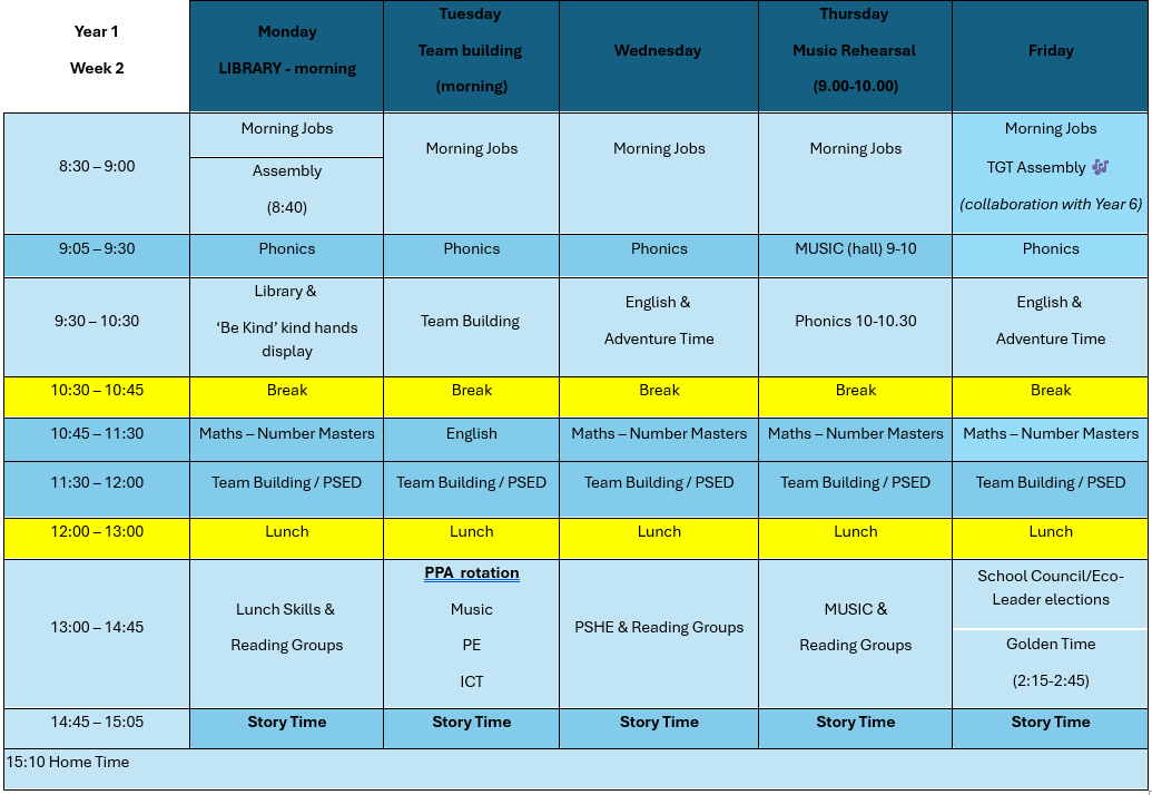 Below is the transition fortnight timetable for Week 1 and Week 2.