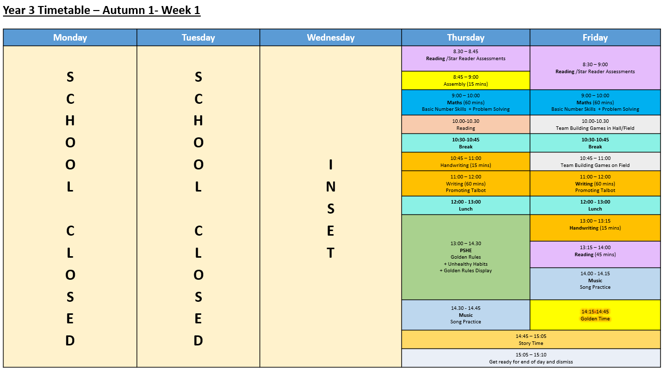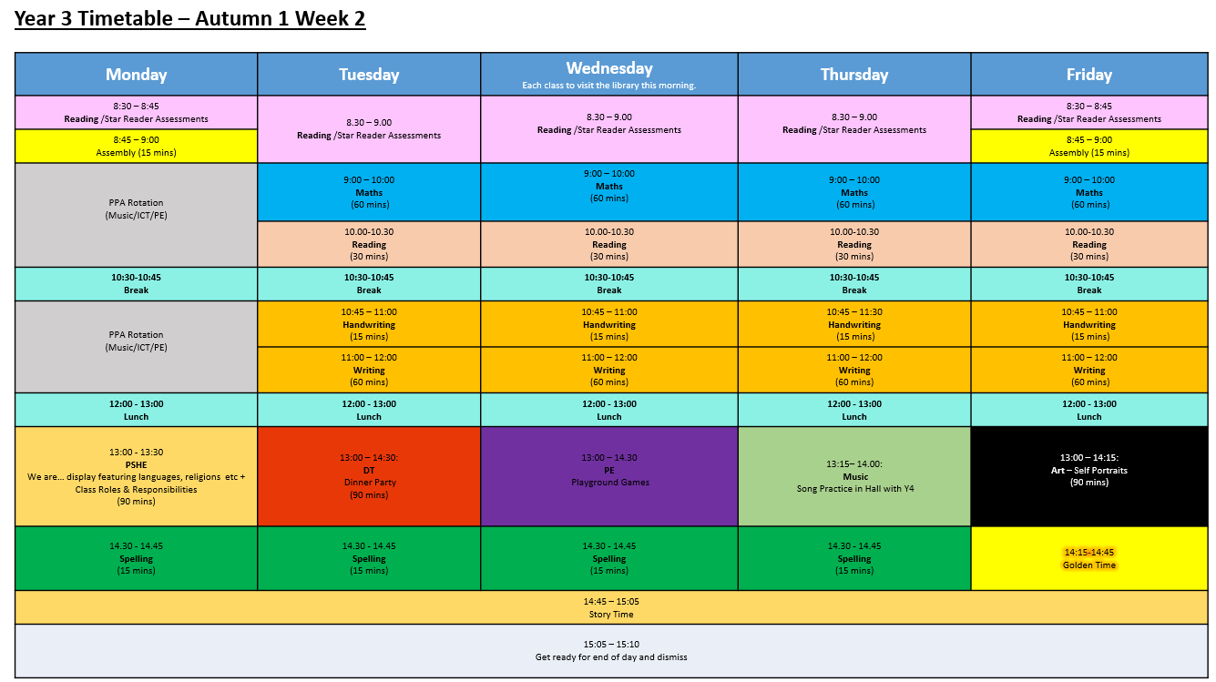 As with last year, we will be beginning the new school year with a 'Transition Fortnight' which will give our pupils the chance to acclimatise to the new faces and surroundings of Year 3. During this time, our timetable will be slightly different from usual, allowing us to embed good routines and behaviour expectations while also allowing the pupils a less intense start to the school year. You can view our full timetable for this period below.