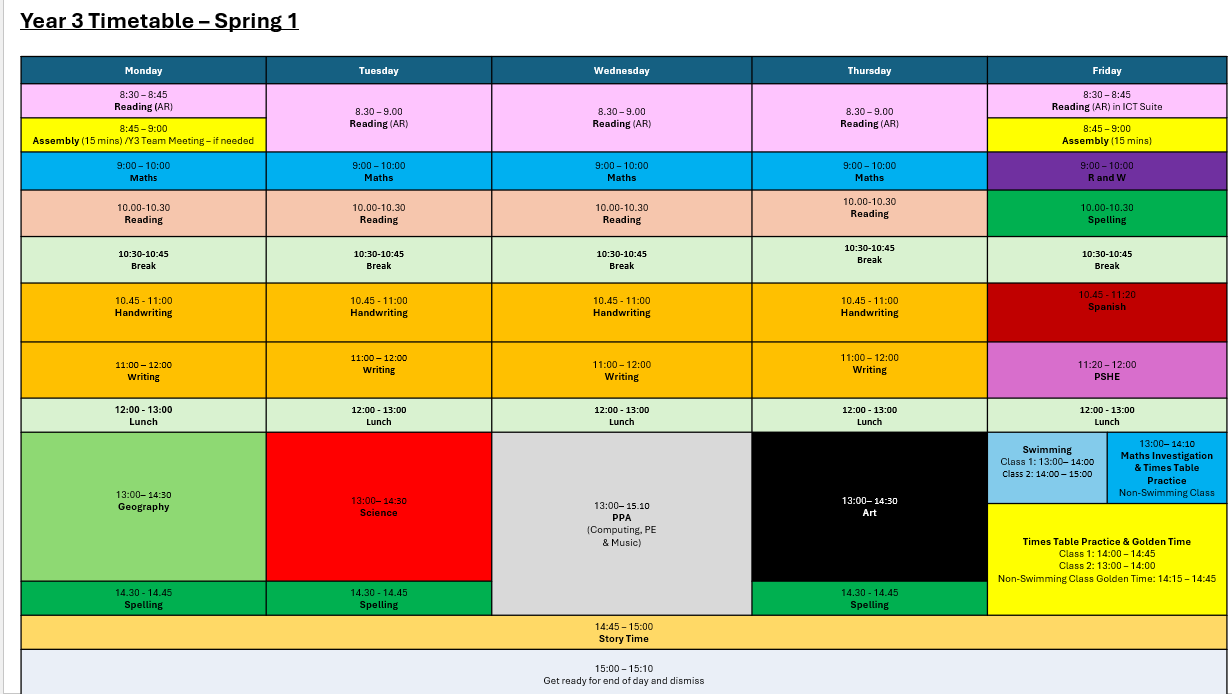 On these days your child must come to school wearing their PE kit. Friday will be swimming so please refer to the timetable below.